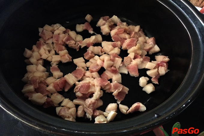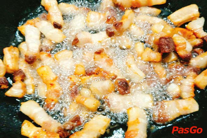 – Bắc chảo lên bếp, cho 1 thìa canh dầu ăn vào, đun sôi rồi cho thịt vào đảo đến khi thịt săn lại, mỡ chảy ra và có màu vàng thì vớt thịt ra.