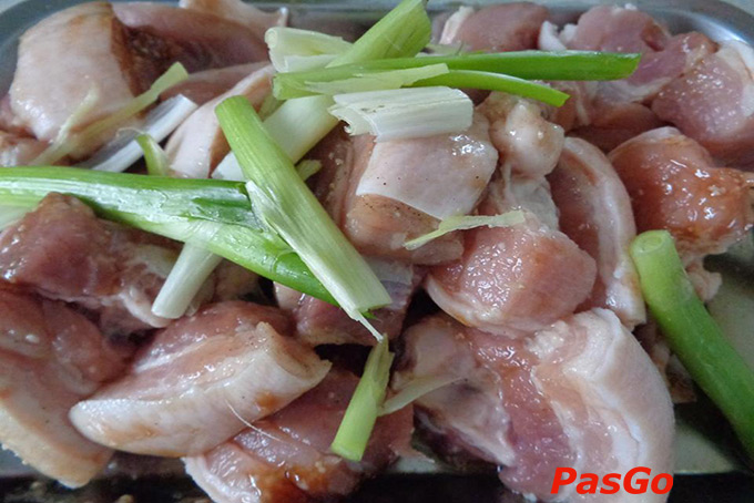 – Thịt mua về rửa sạch, thái thành từng miếng vuông khoảng 2cm.