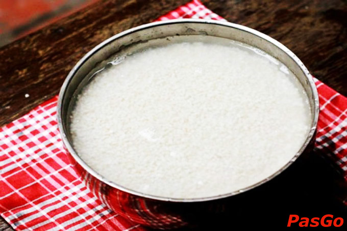 Gạo nếp ngâm trong nước thêm 1 muỗng cà phê muối để cho gạo thấm gia vị, ngâm trong khoảng 2 tiếng đồng hồ. Sau đó vo sạch để ráo.