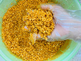 Gạo tẻ cũng lựa loại ngon, ngâm khoảng 3-5 tiếng rồi vớt ra để ráo, sau đó cho vào cối xay thành bột khô. Bột gạo thu được đem nhào cùng bột nghệ đã lọc ở trên, thêm chút muối cho đậm đà.
