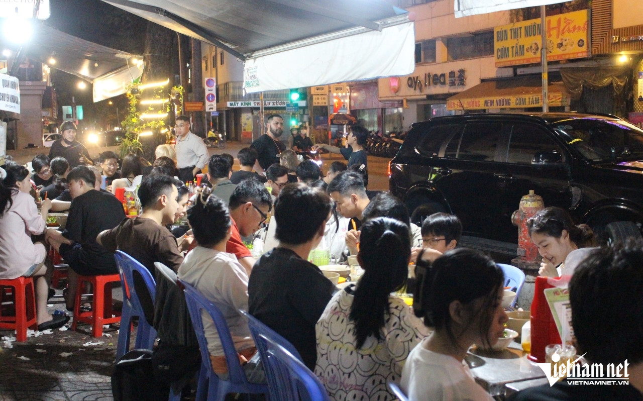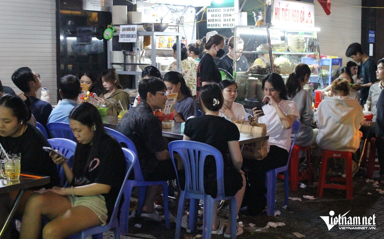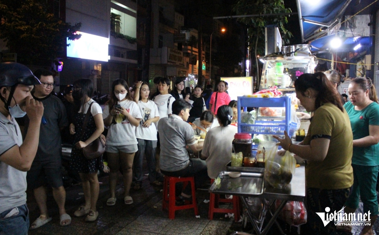 Nửa đêm, đoạn vỉa hè trên đường Trần Bình Trọng (phường Chợ Quán, TPHCM) chật kín người và xe. Ngoài những thực khách đang ngồi kín các bàn ăn đặt trên đoạn vỉa hè, còn có dòng người đứng xếp thành hàng dài phía trước chiếc tủ kính đựng đầy thức ăn.