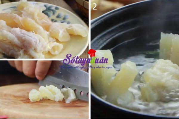 - Đầu tiên, rửa sạch gân bò bằng nước muối pha loãng. Sau đó, đun sôi một nồi nước và thêm gân bò cùng sả đã đập dập vào, nấu trong khoảng 5 – 7 phút. Sau khi nấu xong, vớt gân ra và cắt thành miếng vừa ăn. Đặt gân bò vào một nồi khác với 500ml nước, hầm trong khoảng 20 – 25 phút cho đến khi gân mềm. Sau đó, chờ cho nguội và bỏ ra riêng.
