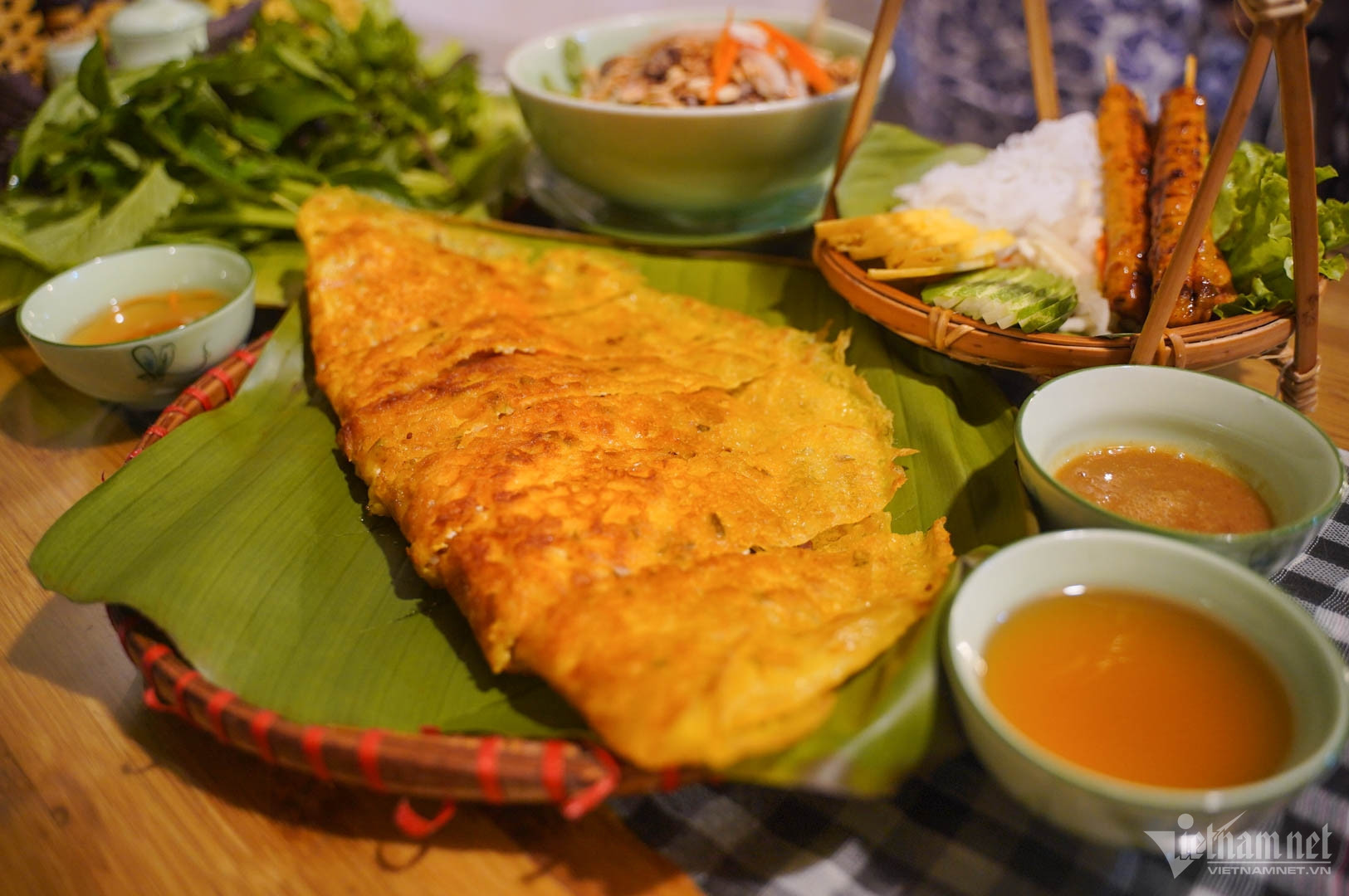 Cô ngạc nhiên với rổ rau sống ăn kèm siêu phong phú, tươi rói với đủ loại như xà lách, bạc hà, tía tô, kinh giới… Nhiều loại rau trong đó nữ du khách không thể phân biệt tên. Nhân bánh đầy đặn với tôm, mực và thịt cá.