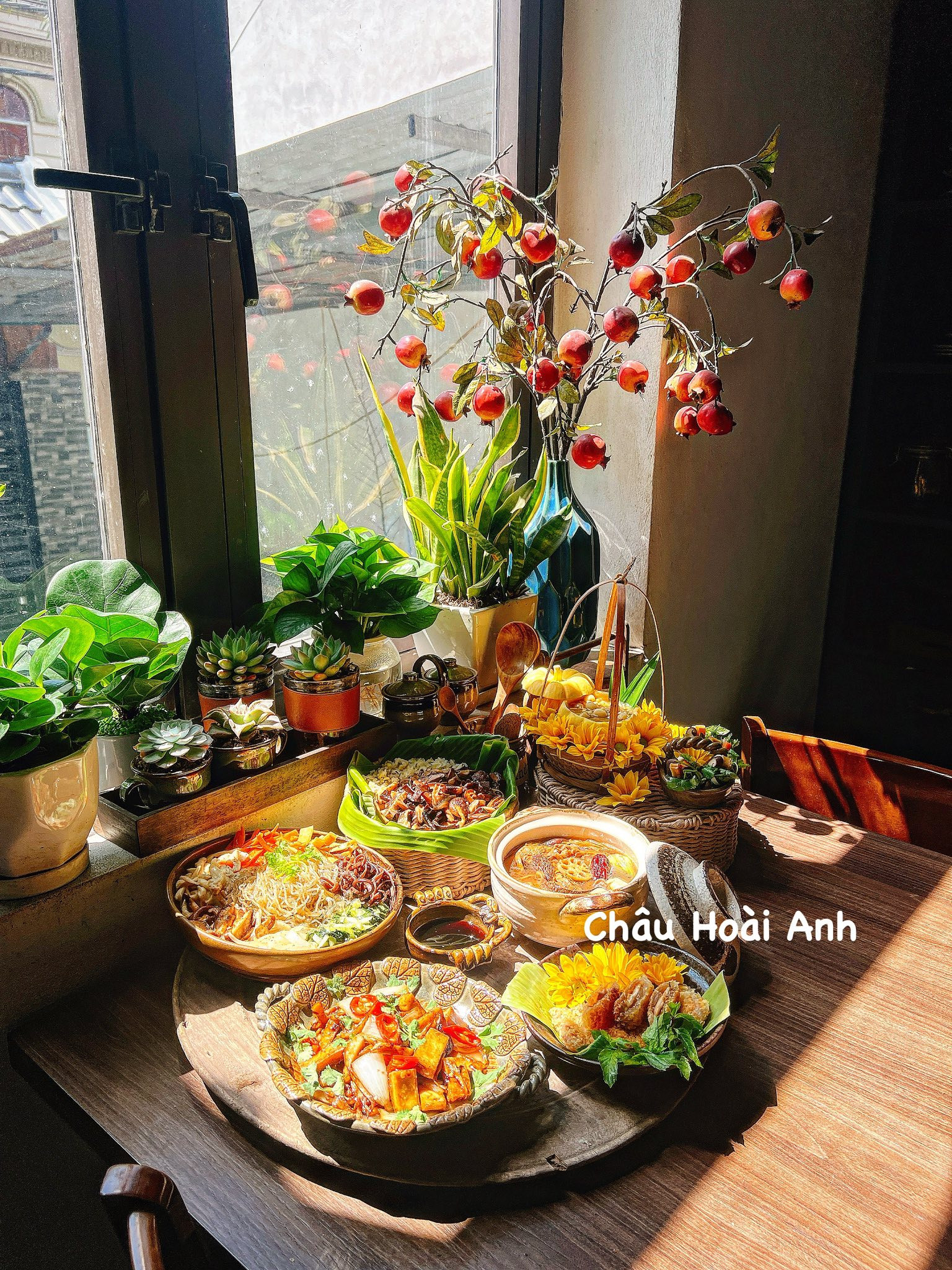 Để có mâm cỗ trọn vẹn, chị thường lên thực đơn và đi chợ từ hôm trước. Rau, củ, thịt, cá đều được sơ chế sẵn, sáng hôm sau chỉ việc bật bếp nấu nướng và bày biện. Thế nhưng, để chuẩn bị đủ 8 món mặn, 4 món phụ và một bát canh, chị phải dậy từ 5h sáng, dành trọn 4 tiếng trong gian bếp.