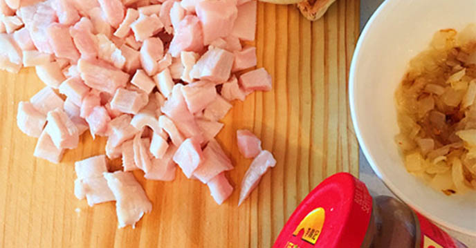 – Thịt sơ chế sạch, thái hạt lựu rồi đem rang cháy cạnh.