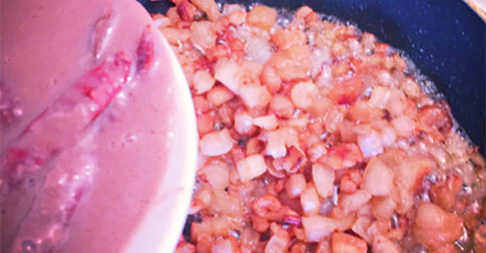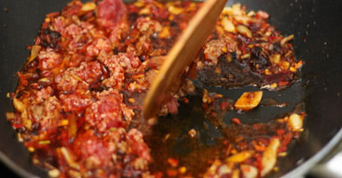 – Hành củ thái nhỏ, phi thơm vàng rồi cho thịt đã rang cháy cạnh vào đảo đều.