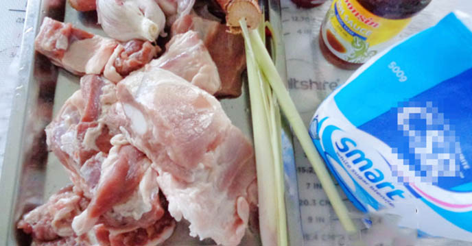– Riềng, sả, tỏi, tiêu và ớt cho vào cối giã nhuyễn. – Sườn sụn rửa sạch, băm nhỏ.