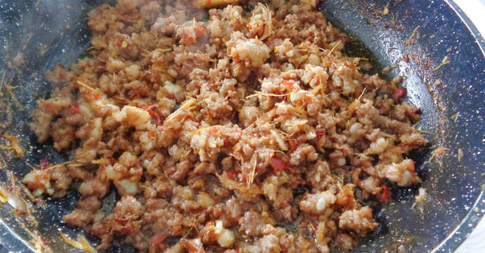 – Cho thịt băm đã ướp gia vị nước mắm vào rang, đảo đều tay và rang đến khi thịt vàng cháy cạnh là được. Lúc này có thể nêm thêm 1 thìa nhỏ đường và mì chính nếu thích.