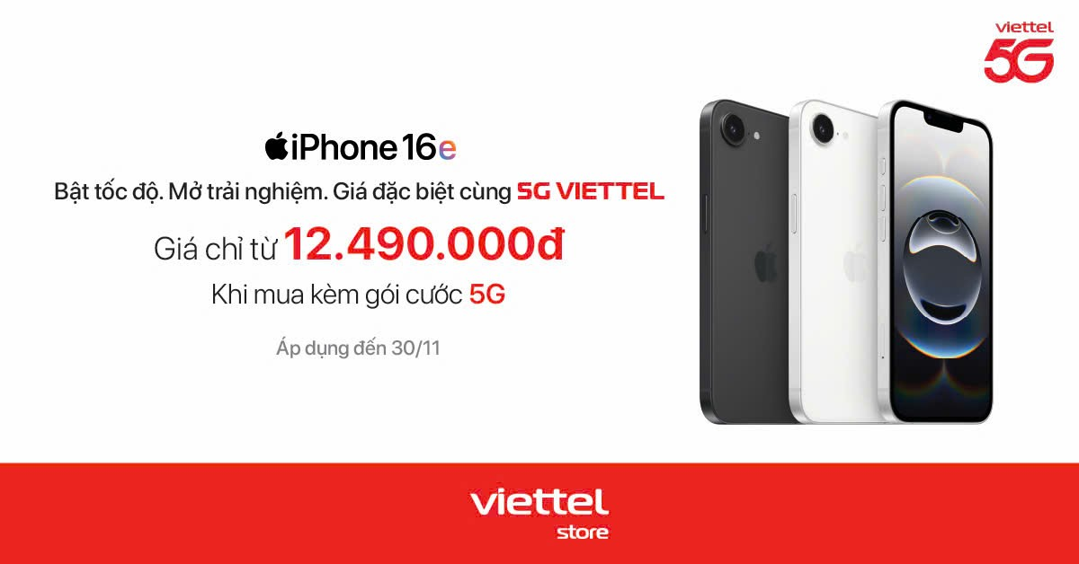 Trong khuôn khổ chương trình ưu đãi, iPhone 16e bản 128 GB và 256 GB được bán với mức giá từ 12,49 triệu đồng (giảm hơn 4 triệu đồng so với giá niêm yết 16,99 triệu đồng) khi đi kèm gói cước 5G Viettel và cam kết sử dụng trong 12 tháng. Trong thời gian cam kết, máy sẽ khóa mạng Viettel và tự động mở khóa sau khi hết thời hạn.