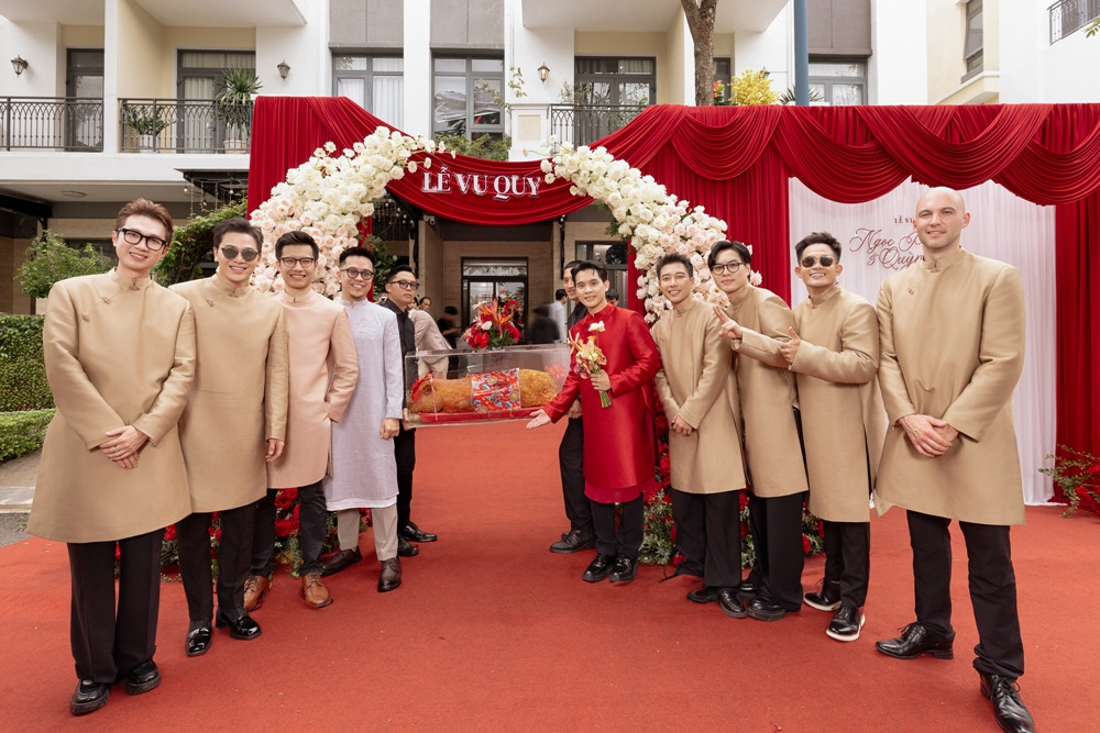 Dàn phù dâu của Quỳnh Châu quy tụ những gương mặt đình đám: siêu mẫu Hoàng Thùy, hoa hậu Lương Thùy Linh, Bảo Ngọc, ca sĩ Khổng Tú Quỳnh, người mẫu Mai Ngô, Kim Dũng, diễn viên Nguyên Thảo và nàng thơ xứ Huế – Ngọc Trân. Dàn phù rể có ca sĩ Mai Tiến Dũng – người từng làm chủ hôn trong MV Mình cưới nhau em nhé của cặp đôi, ca sĩ Quốc Thiên, MC Minh Xù… Đoàn rước dâu với phù rể áo dài nâu be bên trái, phù dâu áo dài hồng bên phải, giữa là mâm long phượng.
