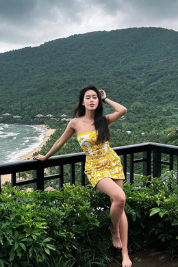 Hay tại khu nghỉ dưỡng ở biển, Tiên Nguyễn xuất hiện trong váy hai dây họa tiết Versace vàng rực rỡ, tôn lên làn da nâu khỏe khoắn. Trong những sự kiện âm nhạc quốc tế, cô chọn trang phục in logo thương hiệu nổi bật như bộ đồ thể thao Dolce&Gabbana đen trắng, thể hiện sự trẻ trung nhưng vẫn đẳng cấp.