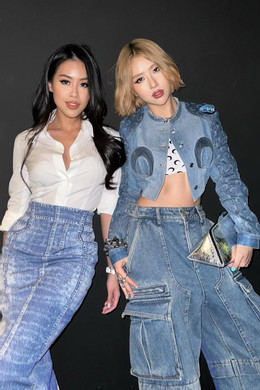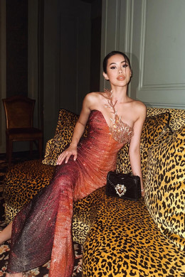 Phong cách dự tiệc của Tiên Nguyễn cũng đầy ấn tượng với những thiết kế cao cấp. Cô từng xuất hiện trong váy body đính kim sa bạc, kết hợp găng tay lụa đen và kính mát. Tại sự kiện Halloween năm 2023, Tiên Nguyễn hóa thân thành nàng hề Harley Quinn với set đồ crop top đỏ đen da bóng cùng phụ kiện tai thỏ.