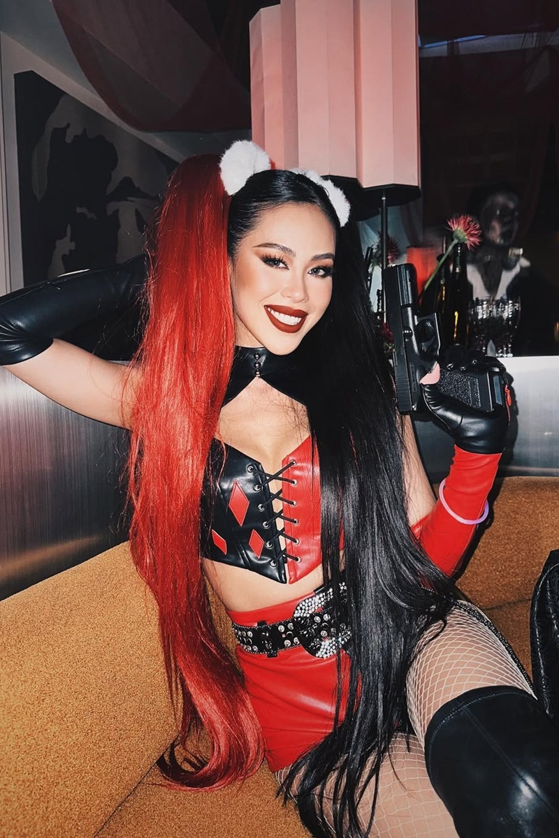 Phong cách dự tiệc của Tiên Nguyễn cũng đầy ấn tượng với những thiết kế cao cấp. Cô từng xuất hiện trong váy body đính kim sa bạc, kết hợp găng tay lụa đen và kính mát. Tại sự kiện Halloween năm 2023, Tiên Nguyễn hóa thân thành nàng hề Harley Quinn với set đồ crop top đỏ đen da bóng cùng phụ kiện tai thỏ.