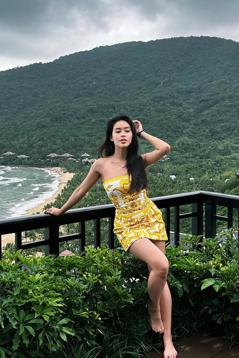 Hay tại khu nghỉ dưỡng ở biển, Tiên Nguyễn xuất hiện trong váy hai dây họa tiết Versace vàng rực rỡ, tôn lên làn da nâu khỏe khoắn. Trong những sự kiện âm nhạc quốc tế, cô chọn trang phục in logo thương hiệu nổi bật như bộ đồ thể thao Dolce&Gabbana đen trắng, thể hiện sự trẻ trung nhưng vẫn đẳng cấp.