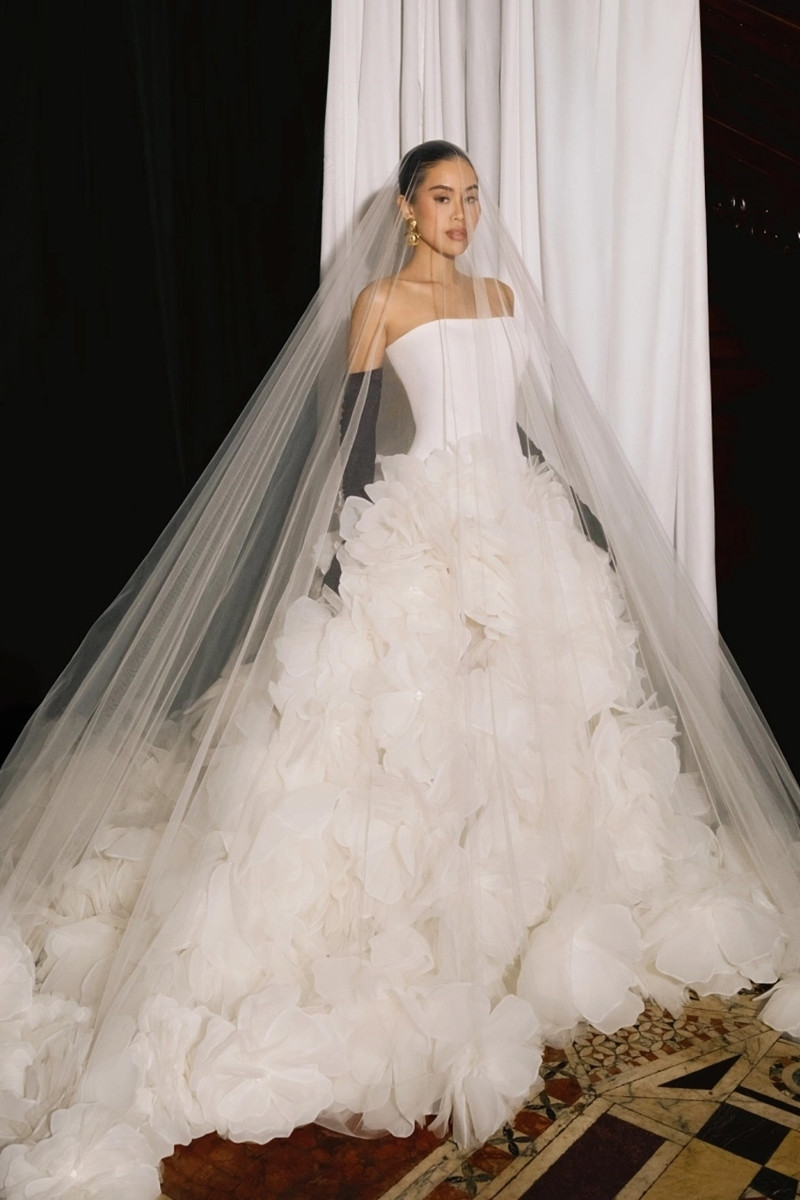 Tiên Nguyễn diện nhiều thiết kế của Nicole Felicia Couture, Berta và Pallas Couture Privée – từ kiểu ren bó sát đến đầm quây cúp ngực gợi cảm. Nổi bật là mẫu đầm đính hoa kết hợp khăn voan dài tạo vẻ lãng mạn, thanh thoát. Chú rể Justin Cohen lịch lãm trong bộ tuxedo đen của Dolce&Gabbana.