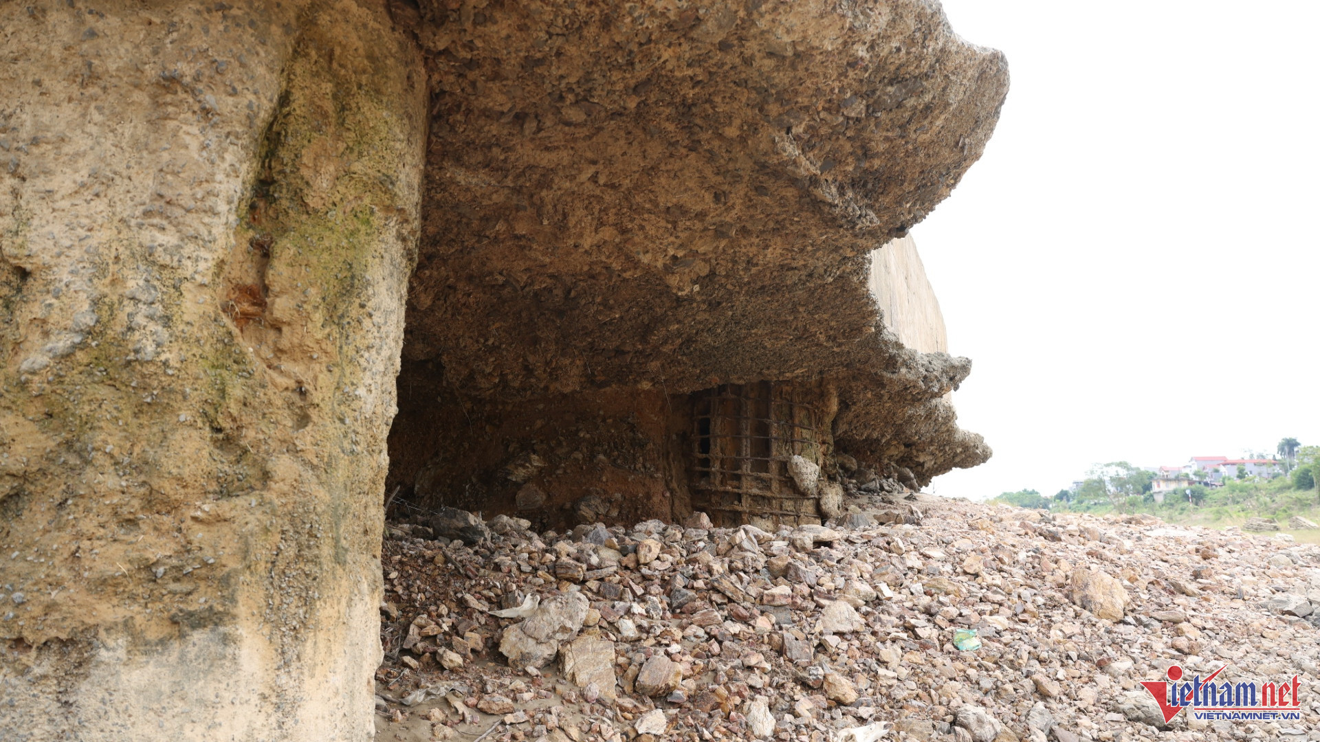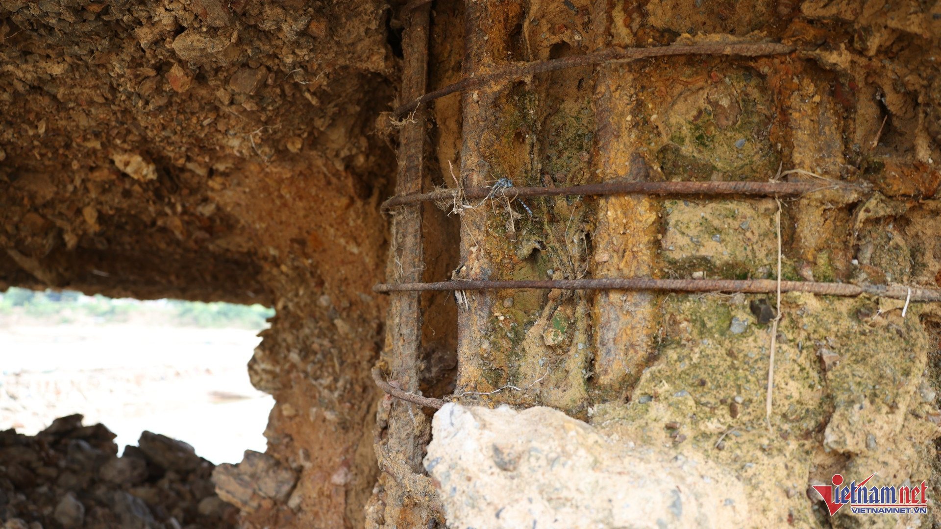 Hiện tại, mực nước sông tại khu vực cầu sông Lô thấp, lộ rõ hàng loạt móng cọc các trụ cầu. Đặc biệt, tại khu vực trụ T3, phần đất nền bị xói lở tạo ra một hốc lớn cao khoảng 2m. Cảnh tượng khiến ai cũng phải lo sợ là cọc khoan nhồi bị hư hỏng nghiêm trọng khi phần cốt thép bên trong đã lộ ra hoàn toàn, bị rỉ sét và không còn bê tông bảo vệ.