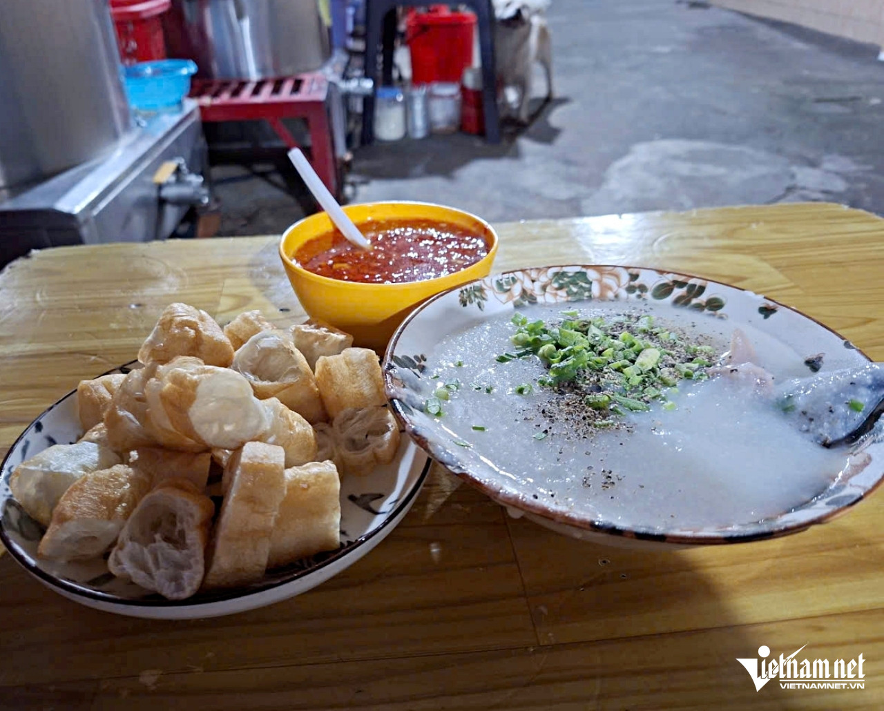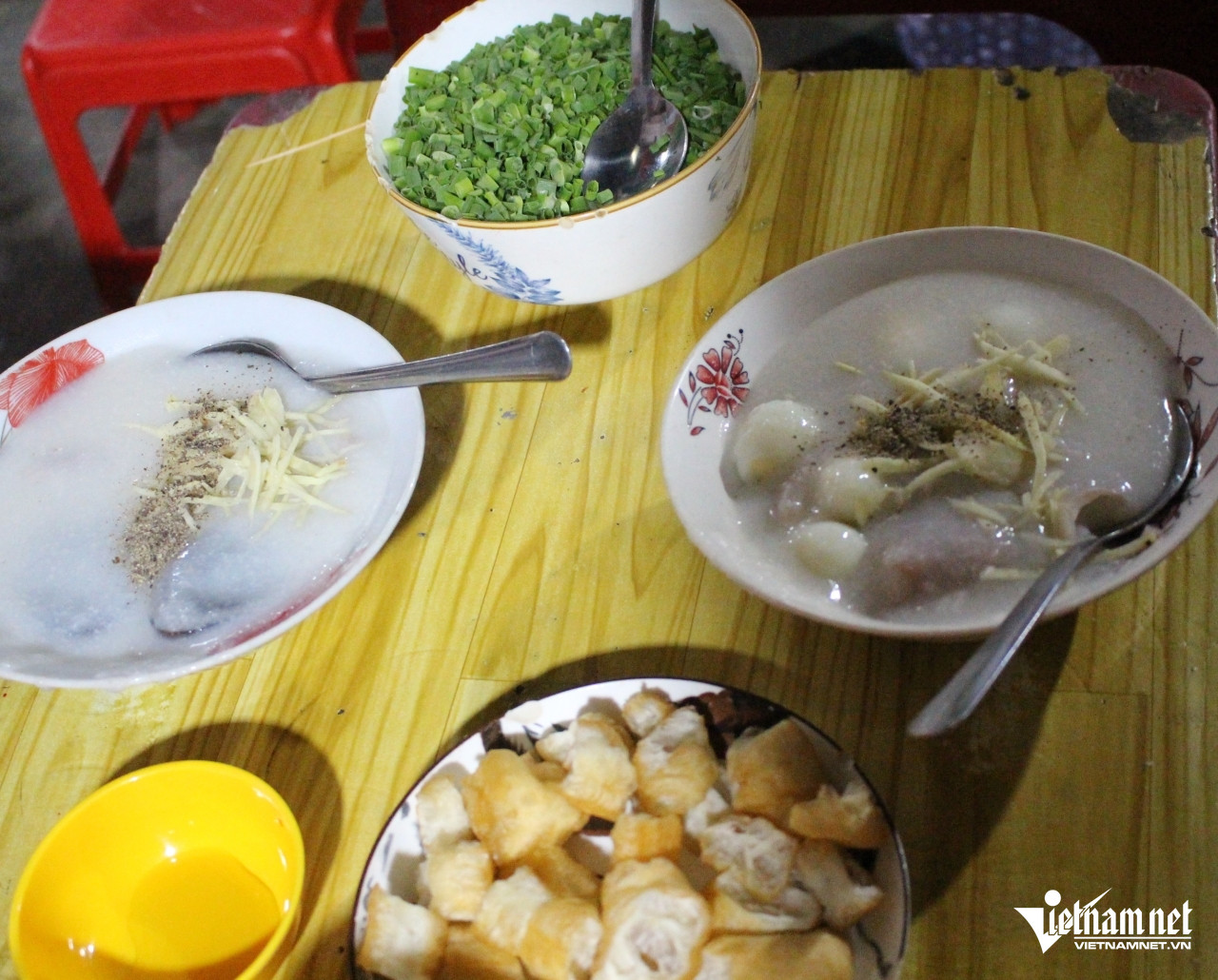 Sau đoạn hẻm tối, cả nhóm dừng lại dưới mái hiên ngôi nhà nhỏ có kê sẵn vài chiếc bàn nhựa thấp. Không gian hơi lụp xụp, nhưng đây lại là một trong những quán cháo đêm nổi tiếng nhất thành phố.