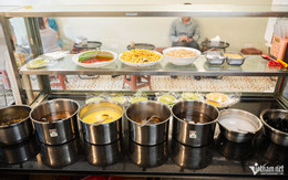 Trong quầy hàng inox sáng bóng, bày biện gần 20 khay nguyên liệu như đỗ đen, đậu xanh nhuyễn, trân châu, hạt sen, xôi vò, thạch đen…, ông Phạm Xuân Thanh (SN 1950) – chủ quán chè Mười Sáu trên phố Lò Đúc, Hà Nội – thoăn thoắt múc chè phục vụ khách.