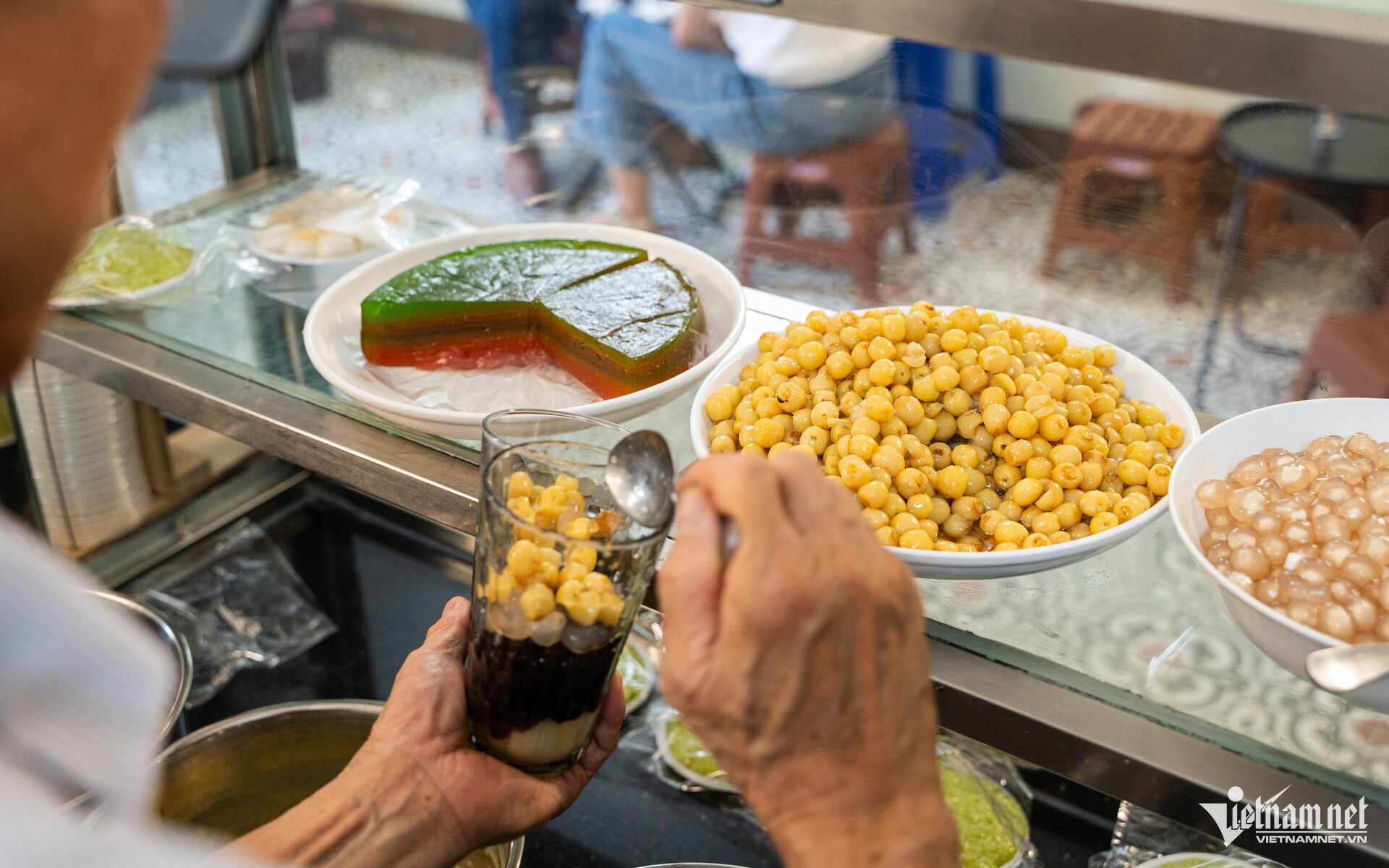 Trong quầy hàng inox sáng bóng, bày biện gần 20 khay nguyên liệu như đỗ đen, đậu xanh nhuyễn, trân châu, hạt sen, xôi vò, thạch đen…, ông Phạm Xuân Thanh (SN 1950) – chủ quán chè Mười Sáu trên phố Lò Đúc, Hà Nội – thoăn thoắt múc chè phục vụ khách.